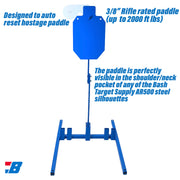 This incredible design integrates an auto reset hostage paddle. The 6” hostage paddle is perfectly visible in the shoulder/neck pocket of any of the Bash Target Supply AR500 steel silhouettes. The hangar is fully rifle rated and tested. The 318 Top Post Gong Hangar Hostage comes with the 3/8” rifle rated paddle (up to 2000 ft lbs). The paddle can be easily swapped for one of our 5/16” (handgun rated) or 1/2” heavy rifle rated AR500 6” paddles (320,322).