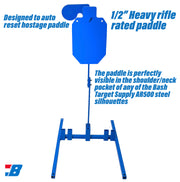 This incredible design integrates an auto reset hostage paddle. The 6” hostage paddle is perfectly visible in the shoulder/neck pocket of any of the Bash Target Supply AR500 steel silhouettes. The hangar is fully rifle rated and tested. The 319 Top Post Gong Hangar Hostage comes with the 1/2” heavy rifle rated paddle. The paddle can be easily swapped for one of our 3/8” light rifle rated paddles or the 5/16” handgun rated AR500 6” paddles (320,321).