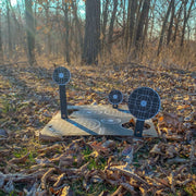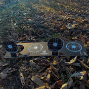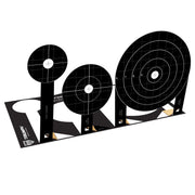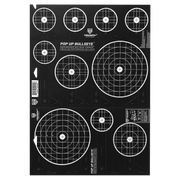 Triumph Systems, Inc. Pop Up Bullseye target are great for all calibers, indoors and outdoors. 10 bullseye targets on that pop up and stay up with a self supporting cardboard stand. This all new product offers perforations to separate the bullseye rows from one another allowing you to place them in different spot for optimal fun and training. Works great with our Shot Seeker brand of reactive adhesive splatter targets.
